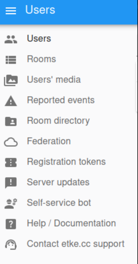 Contact supportbutton, now you can set your own custom menu items usingmenukey inconfig.jsonApart from that, the #synapse-admin:etke.cc room has been created - do not hesitate to say hi!