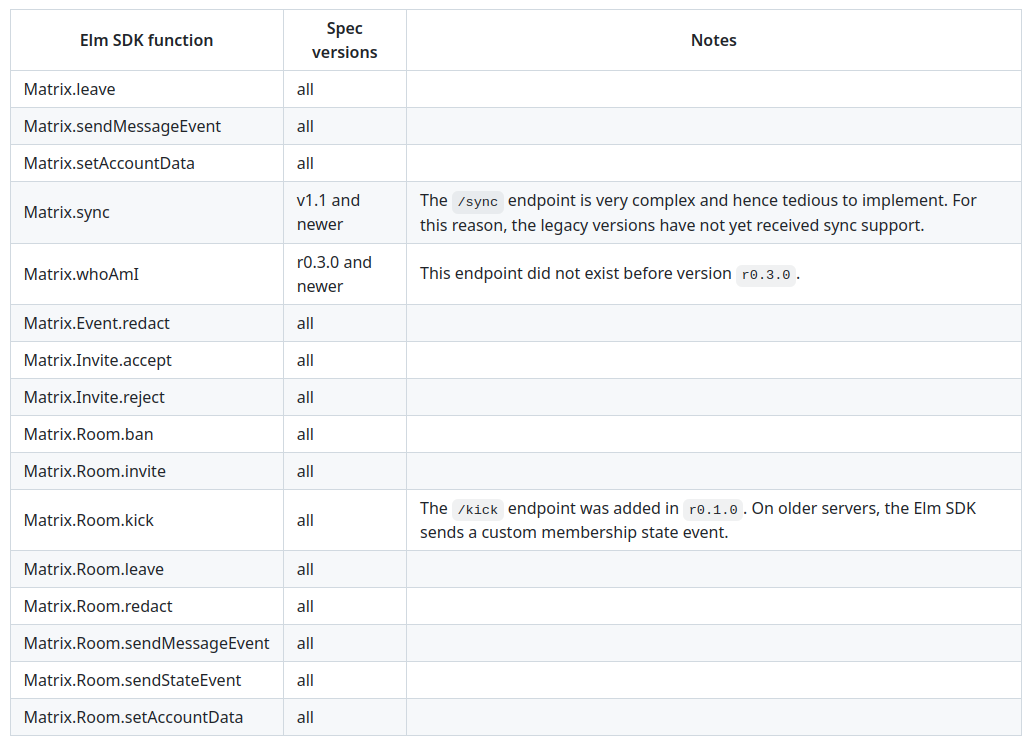 Matrix.Room.name,Matrix.Room.topic&Matrix.Room.pinned_eventsto quickly access the most commonly used state eventsAdditionally, using backwards compatibility, the Elm SDK now supports ALL official spec versions! (Including historical ones.) This means that you can safely update the Elm SDK without needing to wait for your homeserver to update. You can now view the supported versions document for an in-depth table.
